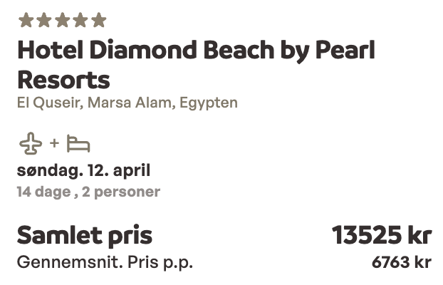 Hvis rejsen er med “Vis fly” og “Vis hotel” link, så er der tale om en sammensat rejse. Det vil sige at fly og hotel skal bestilles hver for sig. Prisen vi angiver vil dog være samlet for fly og hotel med mindre andet er angivet.