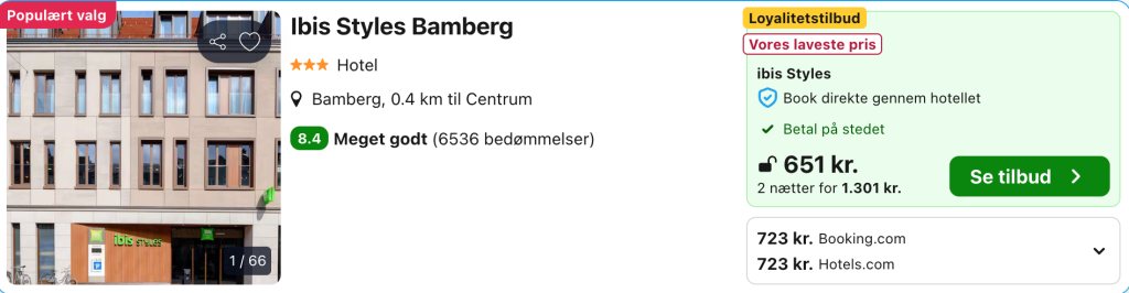 Bemærk: Den samlede pris for hotellet er 1.301,- for 2 personer i et dobbeltværelse hvilket svarer til 651,- per person.