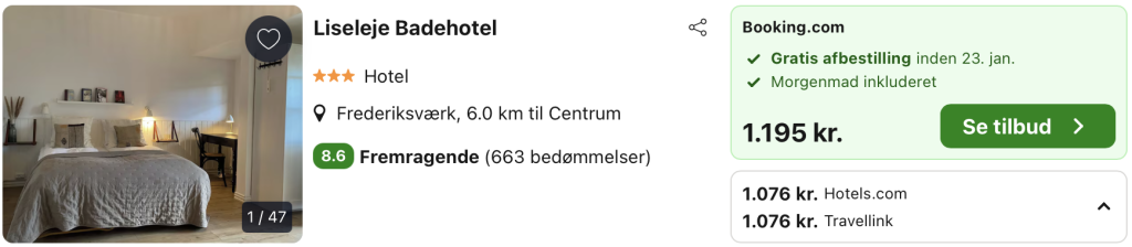 Vi har taget udgangspunkt i et ophold fra den 31. januar – 1. februar på Liseleje Badehotel, der byder på komfortable værelser, der er elegant indrettet med et klassisk dansk design, som reflekterer hotellets maritime arv. Mange af værelserne har udsigt over stranden eller de omkringliggende grønne områder, og de moderne faciliteter som gratis Wi-Fi, fladskærms-tv og minibar sikrer, at gæsterne får en afslappet og komfortabel oplevelse.