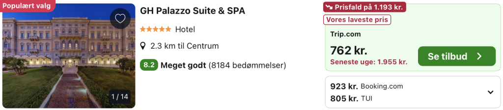 Bemærk: Husk at lade søgningen blive helt færdig. Der kan være mindre prisforskelle på mobil og pc. Undersøg med fordel, hvor det er billigst inden bestilling. Vælg “Vores laveste pris” på trivago, for at opnå den bedste pris på hotellet.