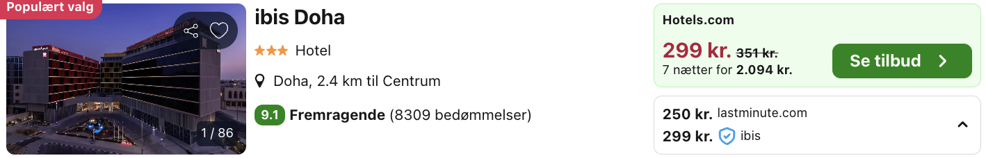 | Bemærk: Husk at lade søgningen på fly og hotel blive helt færdig. Der kan være mindre prisforskelle på mobil og pc. Undersøg med fordel, hvor det er billigst inden bestilling. Vælg “Laveste Pris” på Trivago.