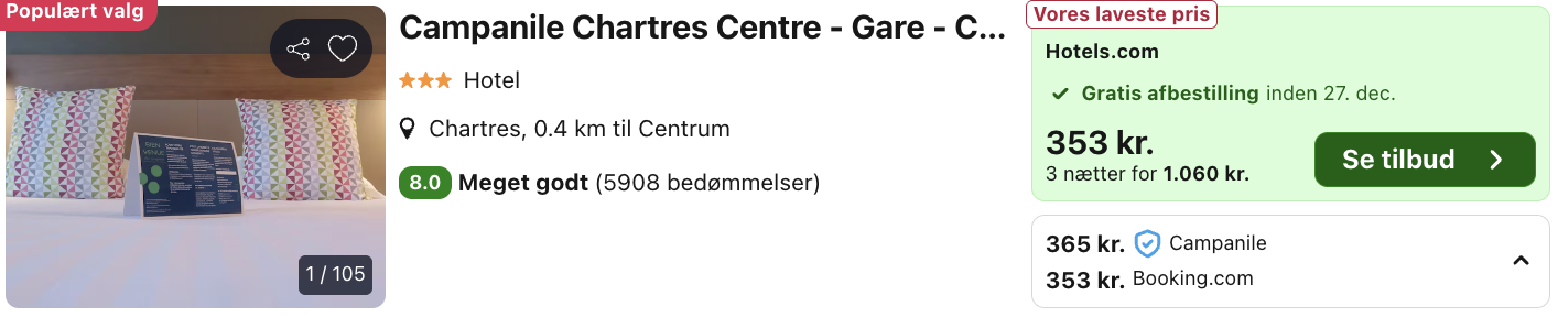 Tjek altid datoerne for at se om de passer sammen før du bestiller, da vi kan have begået fejl. Tjek derudover også prisen på begge ting før du bestiller det ene, da prisen kan have ændret sig. Der kan også være små variationer i prisen mellem mobil og pc.
