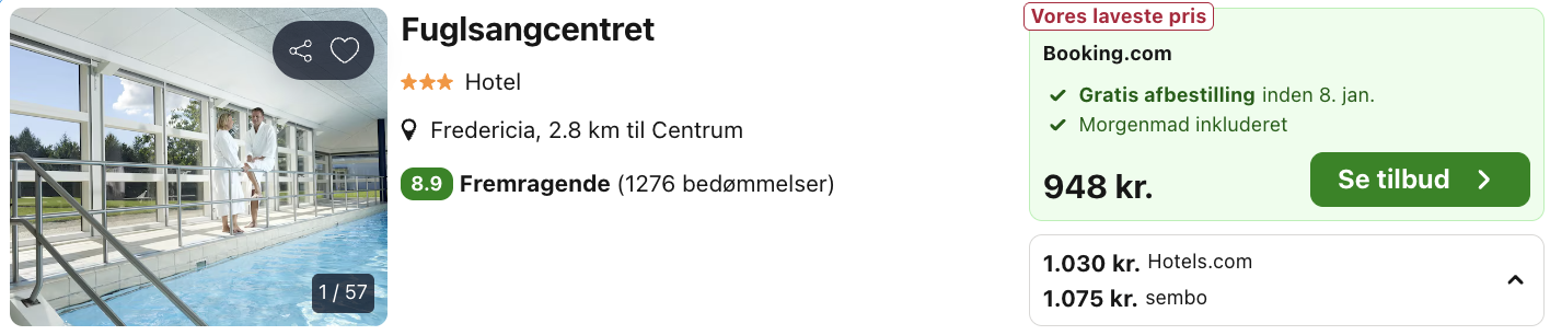 Bemærk: Den samlede pris for opholdet er 948,- for 2 personer i et dobbeltværelse, hvilket svarer til 474,- per person. Der er mange alternative datoer med gode priser. Se flere eksempler længere nede på siden.