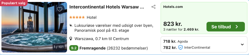 InterContinental Warsaw by IHG er et5-stjernet højhus-hotel med en af byens mest bedste placeringer, hvor du bor midt i Warszawa og samtidig hævet over byens liv. Fra de øvre etager åbner der sig en imponerende udsigt over skyline, moderne kvarterer og ikoniske bygninger, som især gør indtryk i morgentimerne og efter solnedgang, når byen lyser op.