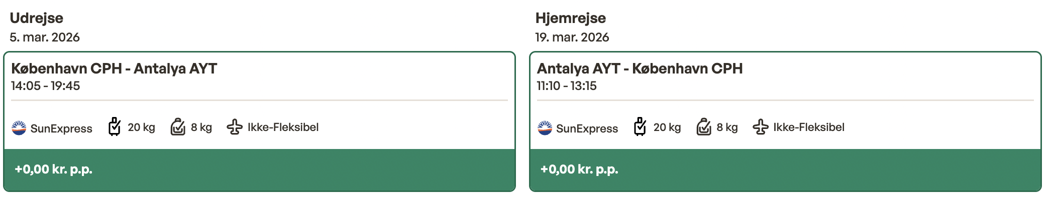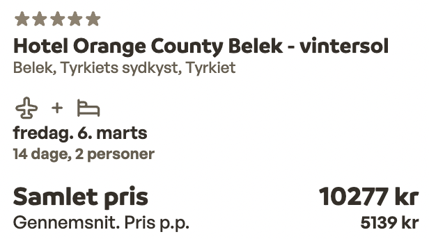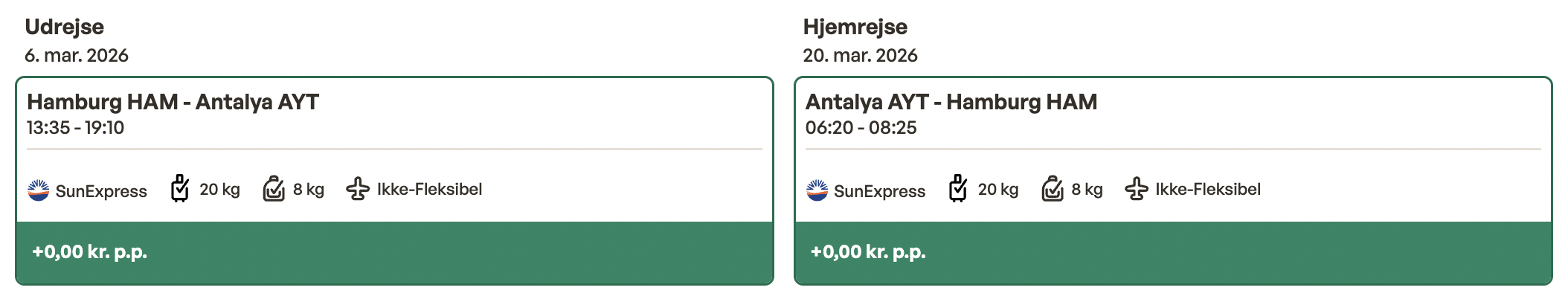 Hvis rejsen er med “Vis rejse” link, så er der tale om en pakkerejse, hvor fly og hotel bestilles på en gang.