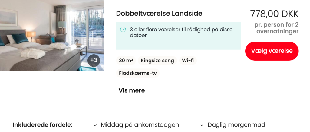 Vi har taget udgangspunkt i et ophold på et dobbeltværelse på landsiden for 2 personer.