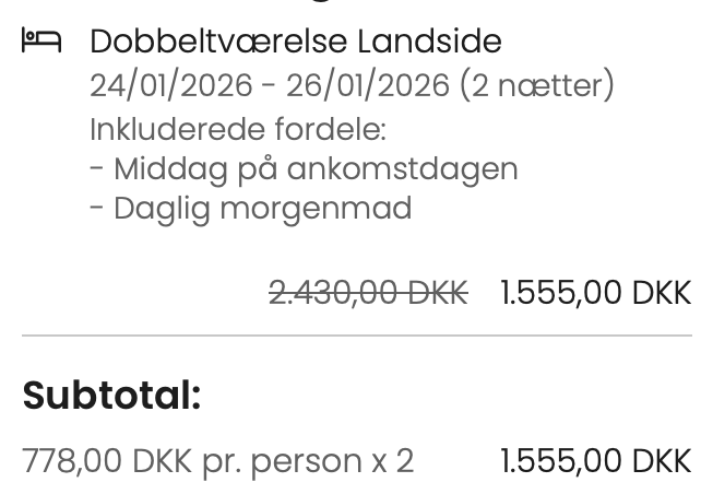 Bemærk: Den samlede pris for opholdet er 1.555,- for 2 personer i et dobbeltværelse, hvilket svarer til 778,- per person. Rejs365 er ikke et rejsebureau, men en rejseside, der finder gode tilbud! – Vi modtager kommission, men det påvirker ikke din pris! Læs mere her