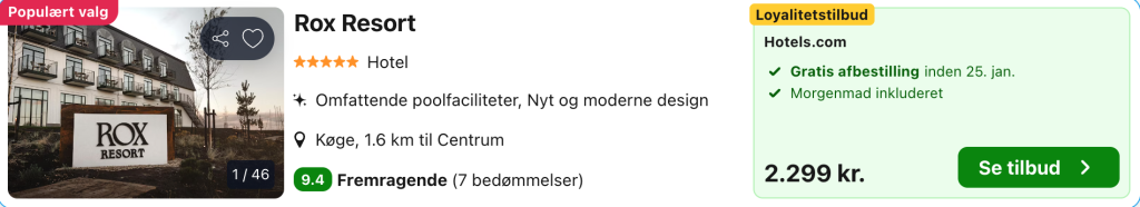 Bemærk: Den samlede pris for opholdet er 2.299,- for 2 personer i et dobbeltværelse, hvilket svarer til 1.150,- per person. Der kan være mindre prisforskelle på mobil og pc. Undersøg med fordel, hvor det er billigst inden bestilling Rejs365 er ikke et rejsebureau, men en rejseside, der finder gode tilbud! – Vi modtager kommission, men det påvirker ikke din pris! Læs mere her |