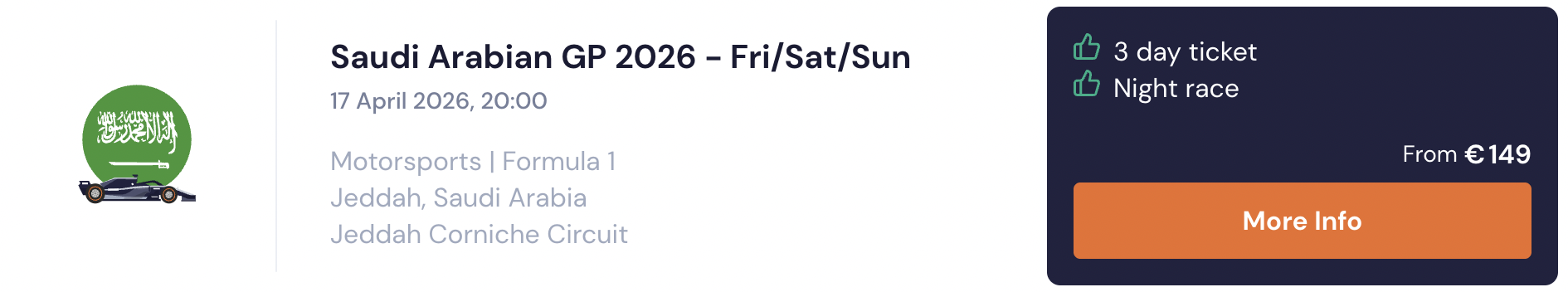 Din 3-dages billet til Formel 1-løb, Saudi-Arabien Grand Prix, inkluderer træninger, kvalifikation og løbet. Løbet er 17. – 19. april.