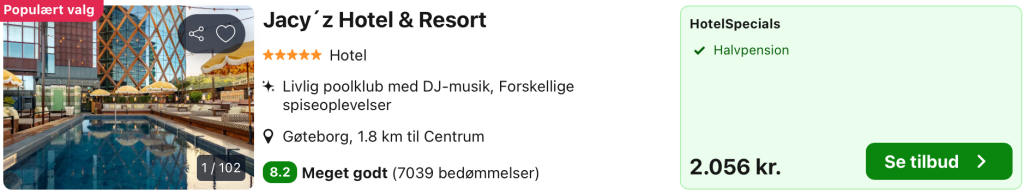 Vi har taget udgangspunkt i et ophold fra den 18. – 19. januar på Jacy’z Hotel & Resort ligger centralt i Göteborg, tæt på både Scandinavium, Liseberg og byens pulserende restaurant- og kulturliv. Hotellet er et moderne lifestyle-hotel med et markant design og en urban resortstemning, hvor luksus, leg og afslapning går hånd i hånd. Værelserne er stilfuldt indrettet med mørke nuancer, komfortable senge og store vinduer, der giver udsigt over byen og skaber en eksklusiv, men afslappet atmosfære.