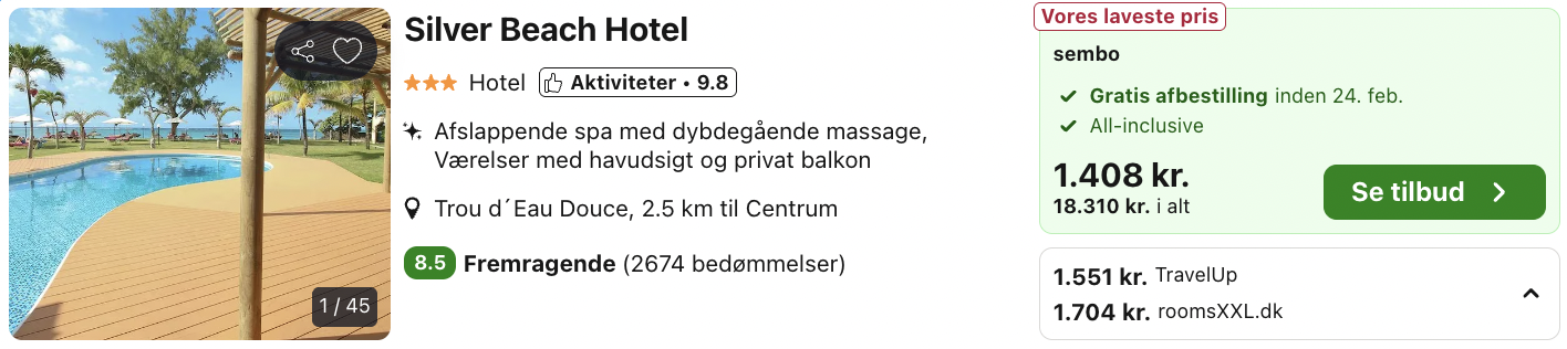 Hvis rejsen er med “Vis fly” og “Vis hotel” link, så er der tale om en sammensat rejse. Det vil sige at fly og hotel skal bestilles hver for sig. Prisen vi angiver vil dog være samlet for fly og hotel med mindre andet er angivet.