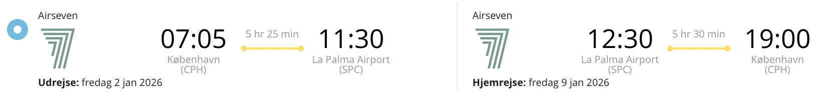 Hvis rejsen er med “Vis fly” og “Vis hotel” link, så er der tale om en sammensat rejse. Det vil sige at fly og hotel skal bestilles hver for sig. Prisen vi angiver vil dog være samlet for fly og hotel med mindre andet er angivet.