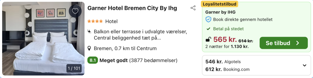 Garner Hotel Bremen City ligger midt i den pulserende del af Bremen med kort afstand til både hovedbanegården og den gamle bydel. Hotellet har en moderne og afslappet atmosfære, hvor indretningen er enkel og lys, og hvor man hurtigt føler sig hjemme. Værelserne er rummelige og praktisk indrettet med komfortable senge, skrivebord og store vinduer, der giver et fint lysindfald.