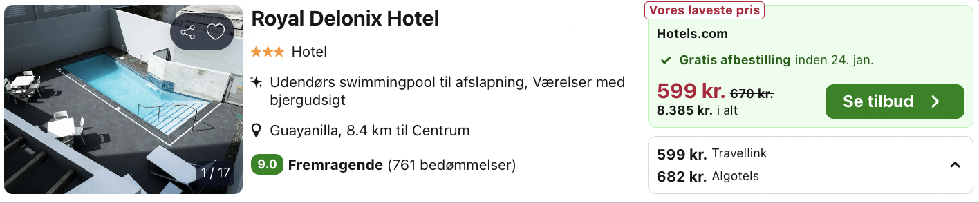 | Bemærk: Den samlede pris for hotellet koster 8.385,- for to personer i et dobbeltværelse, hvilket er 4.193,- pr person. |