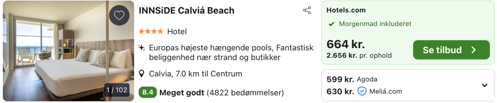 Forkæl dig selv med en ferie til Mallorca og nyd et ophold på det 4-stjernede INNSiDE Calviá Beach. Hotellet ligger tæt på stranden og er et nyt og lækkert 4-stjernet luksushotel med flotte værelser og tagterrasse med skøn havudsigt. Hotellet er dog uden tvivl mest kendt for sin 46 meter lange hanging rooftop-pool, der er den måske mest spektakulære pool i hele Europa.