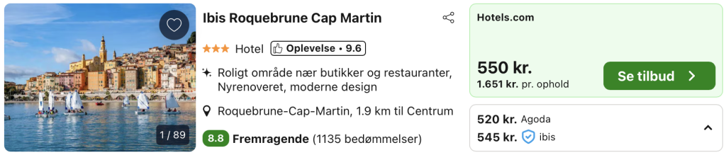 Ibis Roquebrune Cap Martin ligger på den franske riviera mellem Monaco og Menton, få minutters gang fra stranden og den kystnære togforbindelse, der forbinder hele Côte d’Azur. Hotellet har en moderne og funktionel indretning, hvor lyse materialer og en rolig farvepalet skaber en behagelig atmosfære. Værelserne er kompakte, men veludstyrede med komfortable senge, lydisolering og effektiv aircondition, så du får en god base til både badeferie og udflugter langs kysten.