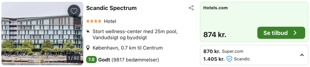 Derudover har hotellet et veludstyret fitnesscenter og gratis Wi-Fi, som er inkluderet i opholdet. Scandic Spectrum har også to restauranter, der serverer alt fra nordiske retter til internationale smagsoplevelser, og en bar på øverste etage med en smuk udsigt over byen. Hotellet er perfekt for både forretningsrejsende og turister, der ønsker at opleve København i stil.