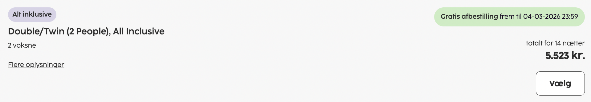 | Bemærk: Hotellet koster 5.523,- for to personer i et dobbeltværelse, hvilket svarer til 2.762,- per person. |