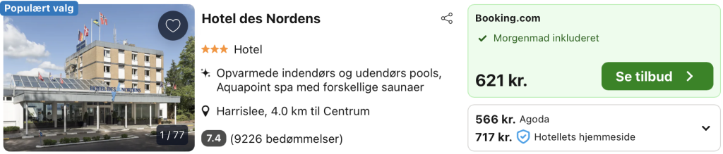 Vi har taget udgangspunkt i et ophold fra den 3. – 4. januar på Hotel des Nordens, der ligger kun 200 m fra den danske grænse og byder på elegante værelser og suiter, alle med gratis wi-fi. Den stilfulde restaurant Rôtisserie serverer internationale og nordtyske retter. Stranden ligger blot 1,5 km fra hotellet, og gæsterne kan benytte den opvarmede indendørs og udendørs swimmingpool året rundt. Gæsterne kan benytte Hotel des Nordens moderne spaområde gratis.