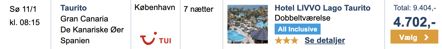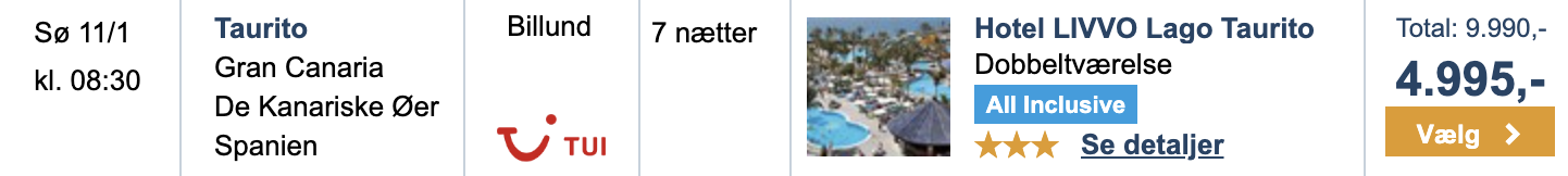 Bemærk: Prisen er ikke opdateret hos Travelmarket endnu, men vises korrekt når man klikker videre til TUI. (TUI viser den samlede pris for 2 personer).