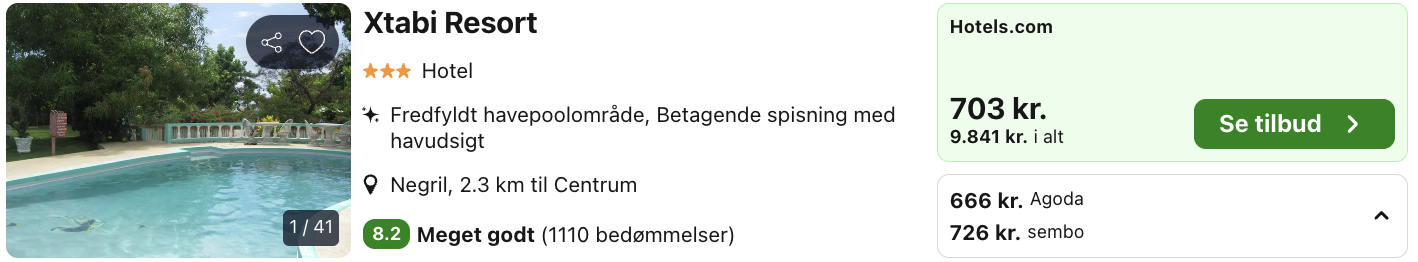 | Bemærk: Den samlede pris for hotellet er 8.404,- for 2 personer i et dobbeltværelse, hvilket svarer til 4.202,- per person. |