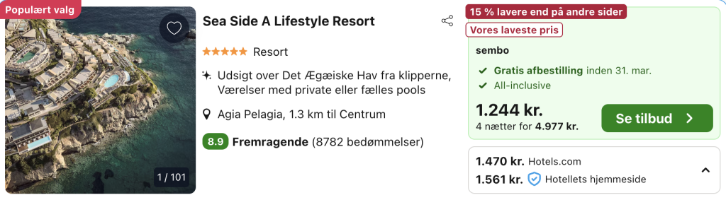 | Bemærk: Den samlede pris for hotellet er 4.977,- for 2 personer i et dobbeltværelse hvilket svarer 2.489,- per person inkl. all inclusive. |