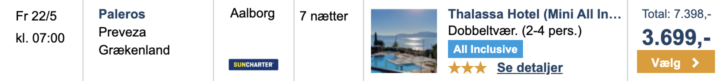 | Bemærk: Travelmarket, Primo Tours, Aarhus Charter og Suncharter viser den samlede pris for 2 personer.