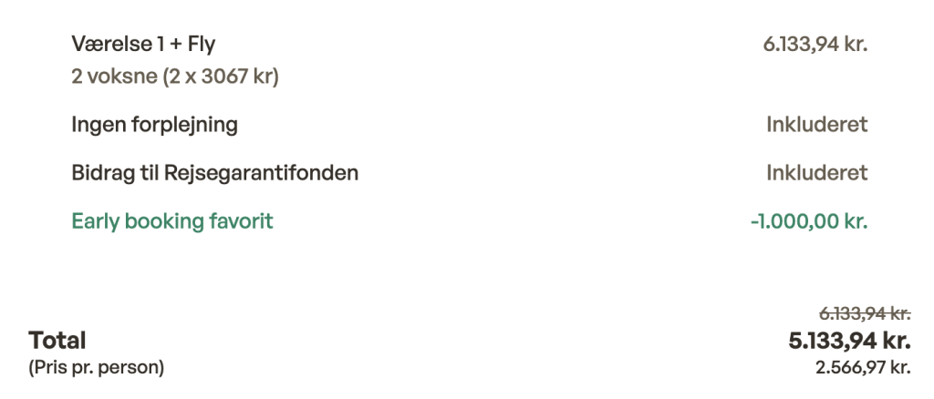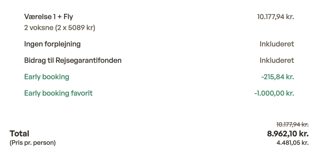 Prisen tager udgangspunkt i 2 personer. Man kan sagtens rejse flere voksne og eller med børn og derved typisk opnå en billigere pris pr. person.