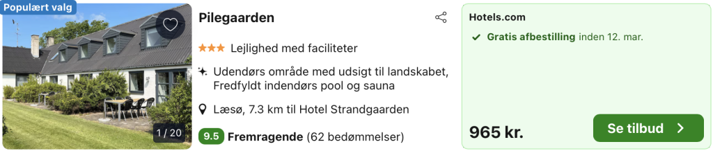Vi har taget udgangspunkt i et ophold fra den 11. – 12. april på Pilegården Læsø, der er et charmerende ferieparadis, der ligger midt på den naturskønne ø Læsø, og tilbyder en perfekt blanding af ro, natur og komfort. Hotellet er ideelt for dem, der søger et fredfyldt ophold i den danske natur, væk fra hverdagens travlhed. Beliggenheden tæt på det fredede naturområde Rønnerne giver gæsterne mulighed for at nyde den enestående natur, hvor dådyr græsser lige uden for døren og den rolige atmosfære gør det muligt at slappe af og lade op.