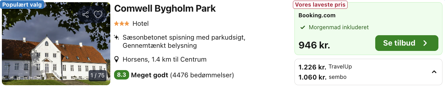 ![]() Bemærk: Den samlede pris for weekendopholdet er 946,- for 2 personer i et dobbeltværelse, hvilket svarer til 473,- per person.Rejs365 er ikke et rejsebureau, men en rejseside, der finder gode tilbud! – Vi modtager kommission, men det påvirker ikke din pris! Læs mere her