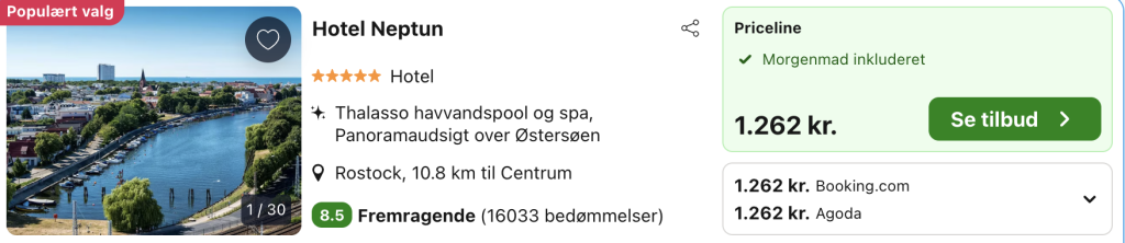 Hotel Neptun er et luksushotel direkte ved stranden i Rostocks elegante badeby, Warnemünde. Her får du panoramaudsigt over Østersøen fra alle værelser, gourmetmad i topklasse og en prisvindende spa, der regnes blandt de bedste i Tyskland. Hotellet er kendt for sin gennemførte kvalitet – fra det eksklusive morgenbord til det høje serviceniveau og de stilfuldt indrettede værelser med balkon og havudsigt.