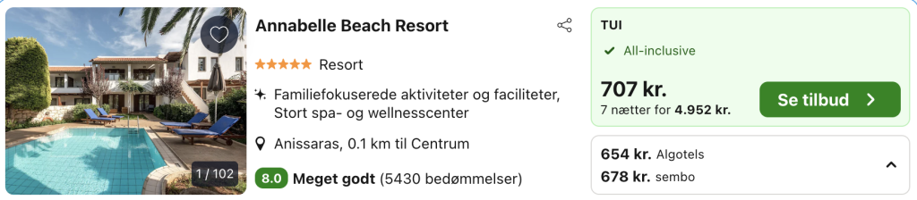 | Bemærk: Den samlede pris for hotellet er 4.578,- for 2 personer i et dobbeltværelse hvilket svarer 2.289,- per person inkl. all inclusive. |