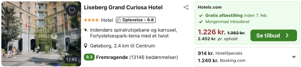 Vi har taget udgangspunkt i et ophold fra den 8. – 9. februar på Liseberg Grand Curiosa Hotel, der er et unikt og eventyrligt hotel beliggende ved siden af Liseberg forlystelsespark i Göteborg. Inspireret af 1800-tallets opdagelsesrejsende er hotellet fyldt med finurlige detaljer, hemmelige døre og nostalgisk charme. Gæsterne kan gå på opdagelse i et univers af kuriositeter, der bringer fantasien til live.