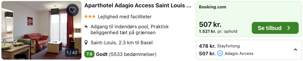 Vi har taget udgangspunkt i det 3-stjernede Aparthotel Adagio access Saint-Louis, der modtager gode bedømmelser fra de tidligere gæster og bl.a. har pæne værelser, indendørs pool og god beliggenhed i Basel.