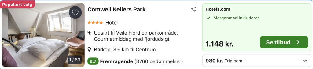 Den samlede pris for opholdet er 980,- for 2 personer i et dobbeltværelse, hvilket svarer til 490,- per person. Der kan være mindre prisforskelle på mobil og pc. Undersøg med fordel, hvor det er billigst inden bestilling. Rejs365 er ikke et rejsebureau, men en rejseside, der finder gode tilbud! – Vi modtager kommission, men det påvirker ikke din pris! Læs mere her |