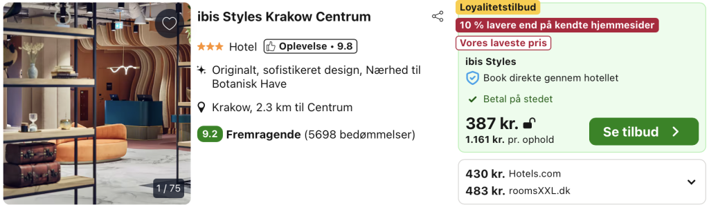| Bemærk: Den samlede pris for hotellet er 1.161,- for 2 personer, hvilket svarer til 581,- per person. |