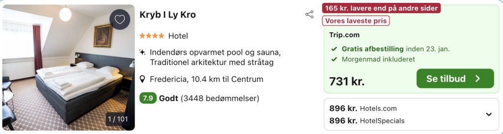 Bemærk: Den samlede pris for opholdet er 731,- for 2 personer i et dobbeltværelse, hvilket svarer til 365,- per person. Der kan være mindre prisforskelle på mobil og pc. Undersøg med fordel, hvor det er billigst inden bestilling. Rejs365 er ikke et rejsebureau, men en rejseside, der finder gode tilbud! – Vi modtager kommission, men det påvirker ikke din pris! Læs mere her