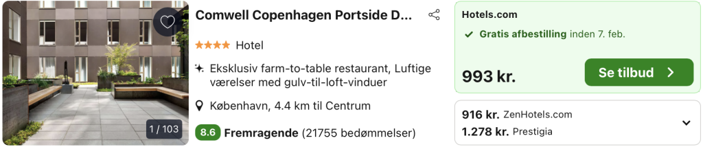 Vi har taget udgangspunkt i et ophold fra den 7. – 8. februar på Comwell Copenhagen, der er et moderne hotel beliggende tæt på centrum af København, hvor byens puls møder en afslappet atmosfære. Hotellet er kendt for sin skandinaviske indretning, lyse rum og en stil, der kombinerer funktionalitet med elegance. Her får man en oplevelse, der både henvender sig til forretningsrejsende, som søger et professionelt miljø, og til dem, der ønsker at nyde en weekend i hovedstaden med komfort og god service.