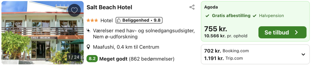 | Bemærk: Den samlede pris for hotellet er 9.834,- for 2 personer i et dobbeltværelse, hvilket svarer til 4.917,- per person.Flyet lander på Maldiverne den 13. marts. |