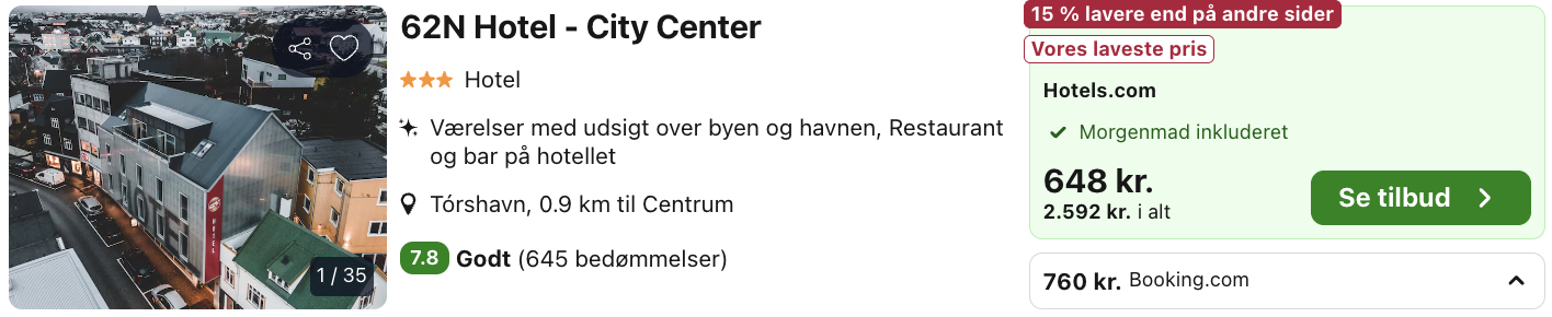 Hvis rejsen er med “Vis fly” og “Vis hotel” link, så er der tale om en sammensat rejse. Det vil sige at fly og hotel skal bestilles hver for sig. Prisen vi angiver vil dog være samlet for fly og hotel med mindre andet er angivet.