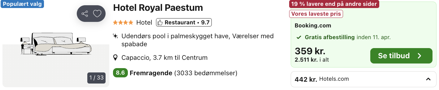 | Bemærk: Hotellet koster 2.511,- for to personer i et dobbeltværelse, hvilket svarer til 1.256,- per person. Husk at vælge den billigste pris. |