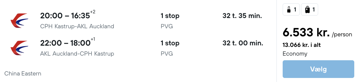 Udrejse fra København er den 19. februar, mens ankomst i Auckland er den 21. februar. |