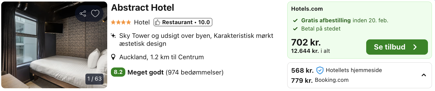Rejs365 er ikke et rejsebureau, men en rejseside, der finder gode tilbud! – Vi modtager kommission, men det påvirker ikke din pris! Læs mere her Udrejse fra København er den 19. februar, mens ankomst i Auckland er den 21. februar. |