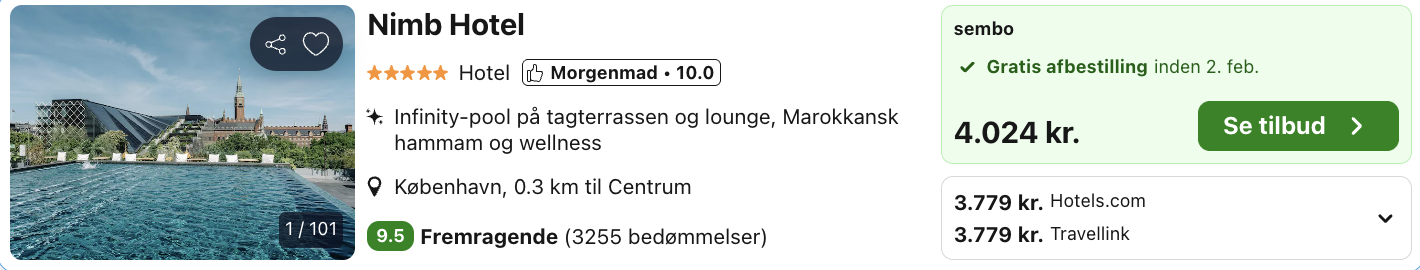 Ophold på det eksklusive og luksuriøse 5-stjernede Nimb Hotel for kun 1.890,- per person inkl. adgang til tagterrasse med opvarmet rooftop-pool og spektakulær udsigt over København samt adgang til Nimb Wellness!