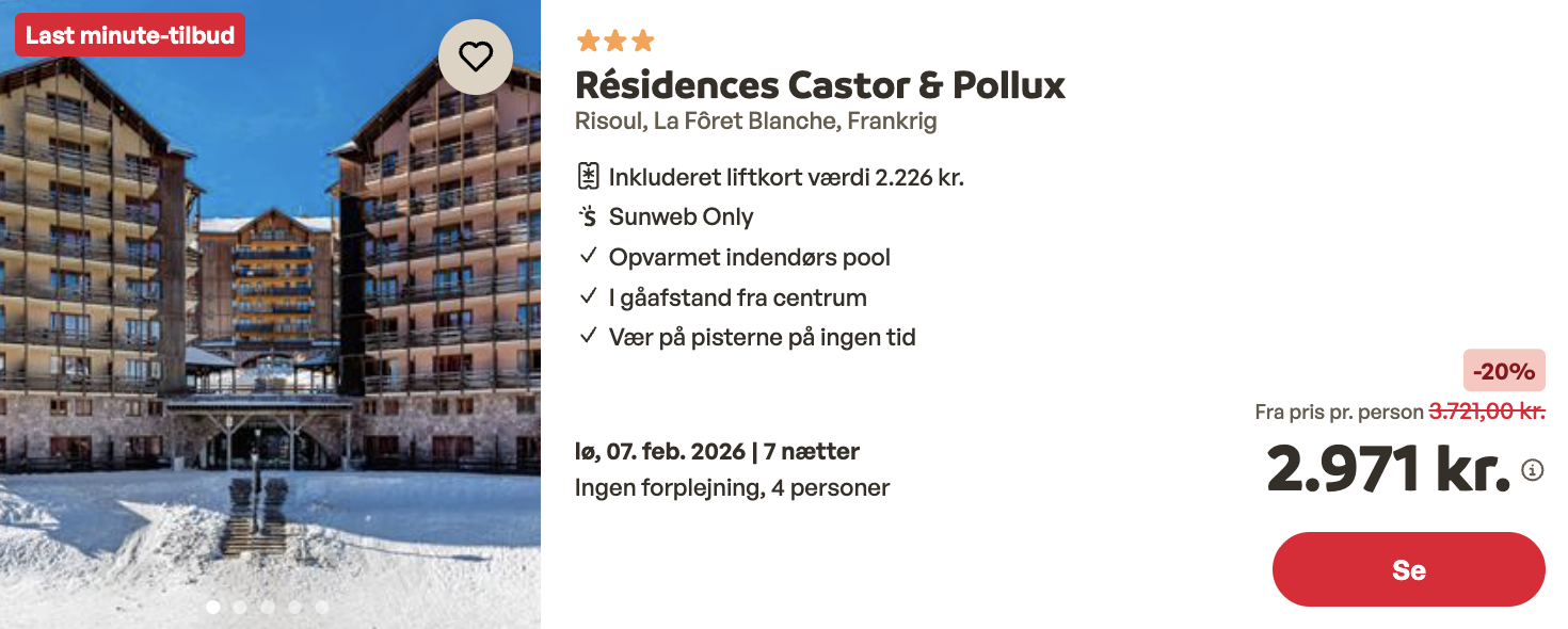 6-dages liftkort er inkluderet. Opgradering til 7-dages liftkort er gratis.