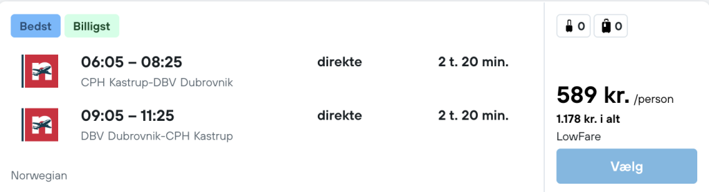 På vores flysøgningsmaskine har vi fundet billige flybilletter fra København til Dubrovnik: