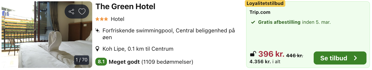 | Bemærk: Husk at lade søgningen blive helt færdig. Vælg Laveste Pris på Trivago. Der kan være mindre prisforskelle på mobil og pc. Undersøg med fordel, hvor det er billigst inden bestilling.
