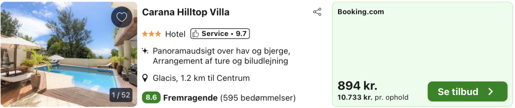 Carana Hilltop Villa på Seychellerne er et intimt og charmerende overnatningssted beliggende på Mahé, øens største og mest besøgte ø. Villaen ligger smukt placeret på en bakketop omgivet af tropisk natur, hvorfra man har udsigt til det frodige landskab og det azurblå Indiske Ocean. Stedet er kendetegnet ved sin rolige atmosfære og personlige stemning, hvilket gør det ideelt for gæster, der ønsker en mere privat og autentisk oplevelse af Seychellerne.