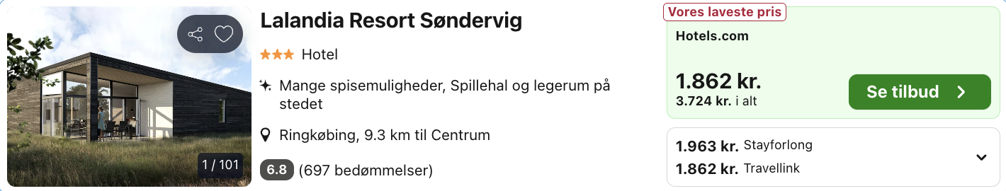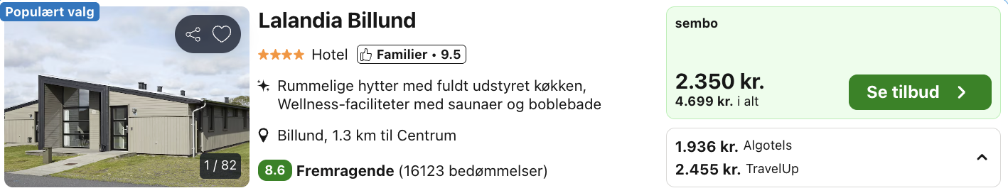 Den samlede pris for opholdet i Søndervig er 3.724,- for 4 personer i en feriebolig, hvilket svarer til 931,- per person. Den samlede pris for opholdet i Billund er 3.872,- for 4 personer i en feriebolig, hvilket svarer til 968,- per person. Rejs365 er ikke et rejsebureau, men en rejseside, der finder gode tilbud! – Vi modtager kommission, men det påvirker ikke din pris! Læs mere her |
