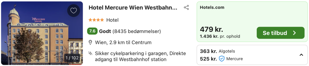 | Bemærk: Den samlede pris for overnatningen er 1.089,- for 2 personer i et dobbeltværelse, hvilket svarer til 545,- per person. |